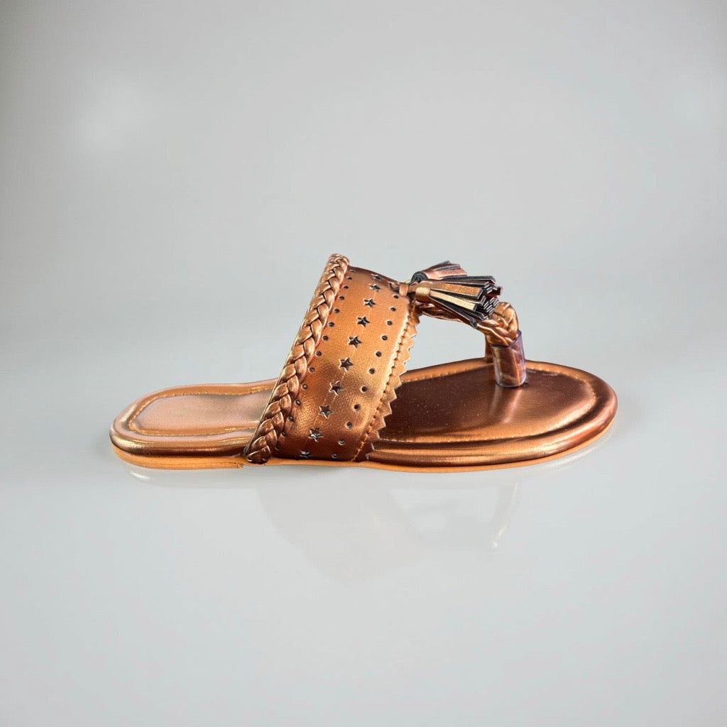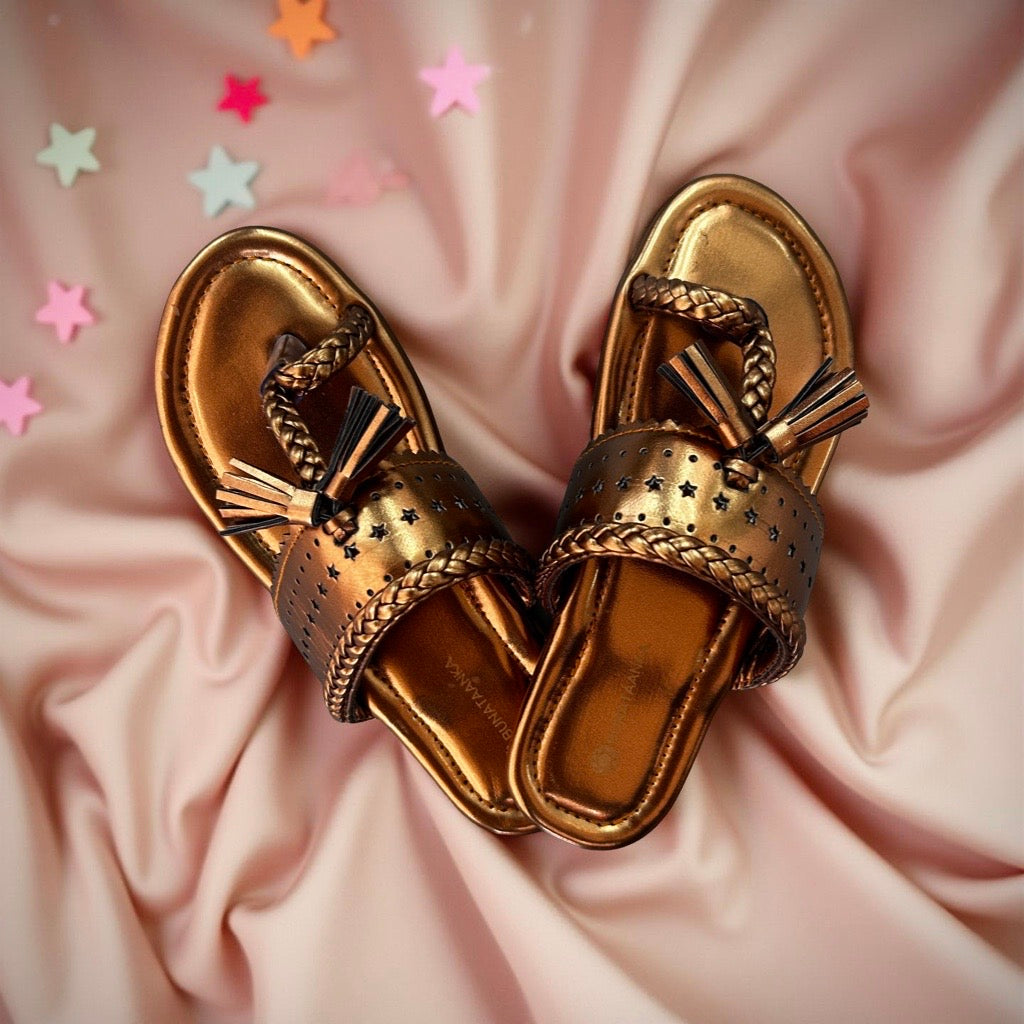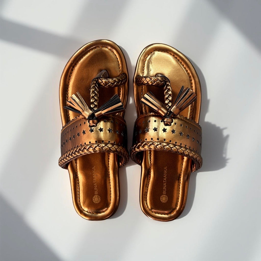 Crafted for young feet, these Copper Kolhapuri sandals blend traditional design with durable copper accents. Featuring authentic tassels and finely braided detailing, they offer both style and comfort for kids. Perfect for everyday wear or special occasions, these sandals provide a secure fit while showcasing heritage craftsmanship.