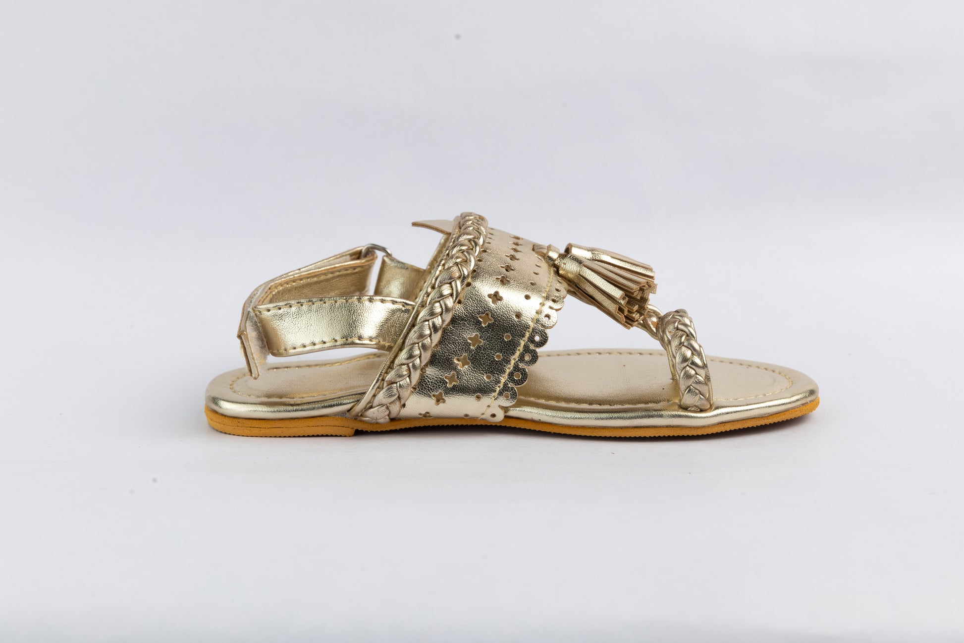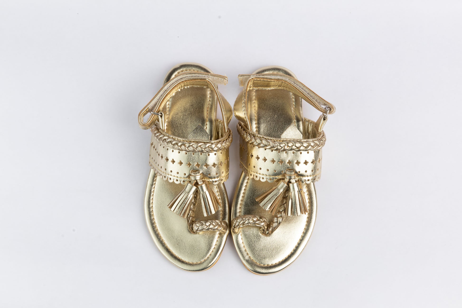 Golden Delight Sandals are a radiant and charming pair of traditional Indian sandals designed exclusively for children. Crafted with a rich golden hue, these Kolhapuri chappals exude a sense of festivity and joy. They are adorned with intricate detailing that showcases the rich heritage of Indian footwear. Perfect for special occasions or adding a touch of cultural elegance to everyday outfits, these Kolhapuris will make your child's feet shine with style and tradition. With their golden brilliance, they are a symbol of beauty and celebration.